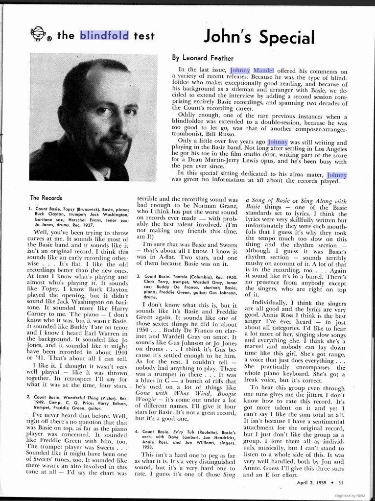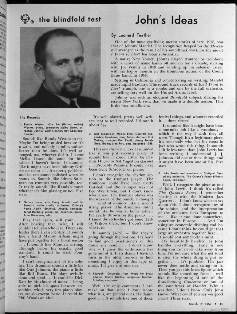 From 1958, there is audio of Leonard Feather giving Mandel a blindfold test. Mandel generally impresses with who he recognizes, even though Feather pitches him a few unfair curveballs. Mandel is also strikingly critical: “The recording quality is bad enough to be Norman Granz, who has put the worst sounds on records ever made with probably the best talent involved.”