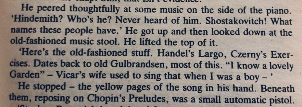 “Did you know Professor Haggerty well?” “Hardly. I did escort her to one or two college functions, as well as the opening concert of the fall season. We discovered a common passion for Hindemith.” — Ross MacDonald, THE CHILL