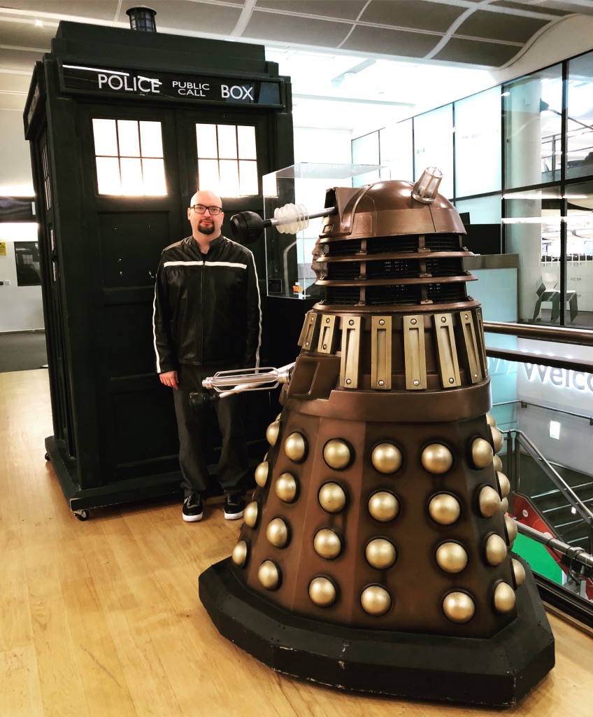 Here I am with the TARDIS and a Dalek in a 2019 photo taken by Rob Schwimmer at the BBC offices in Birmingham: