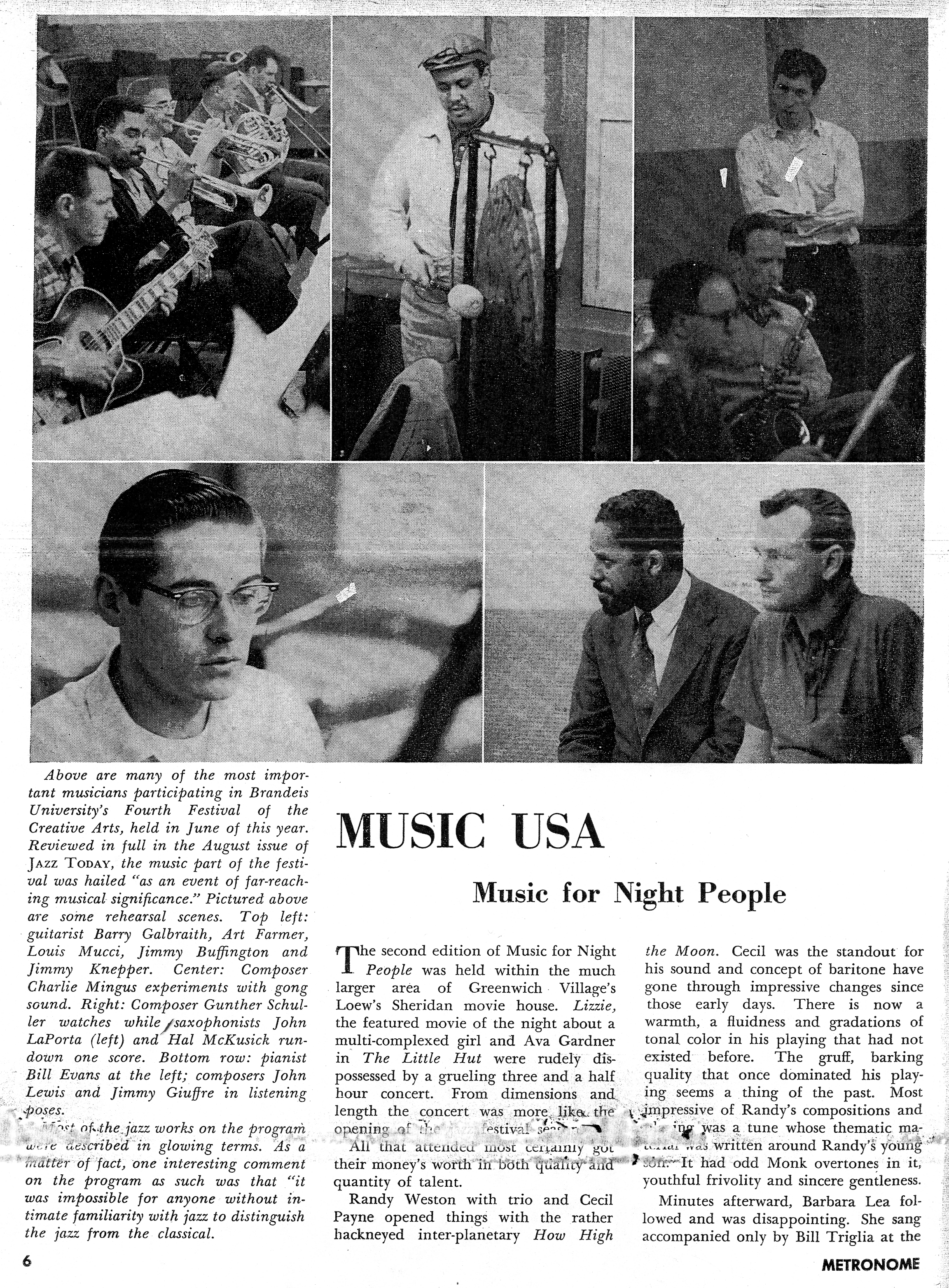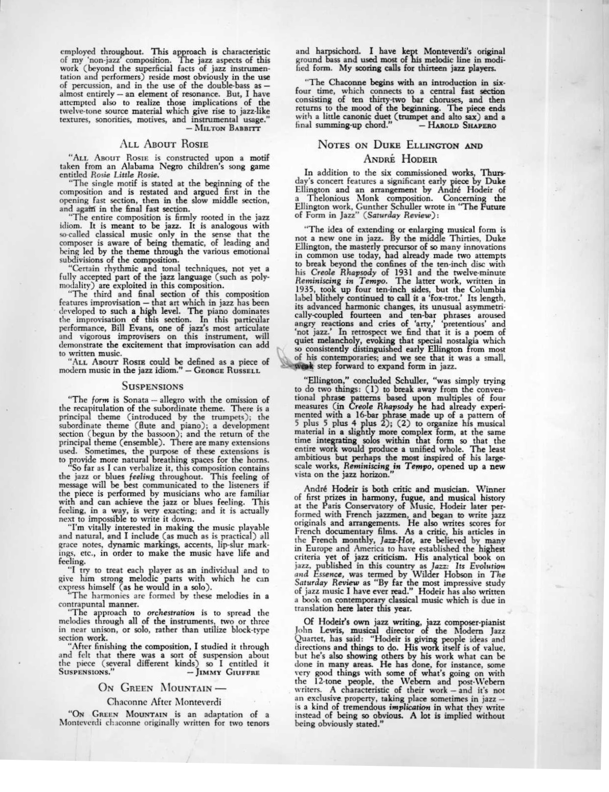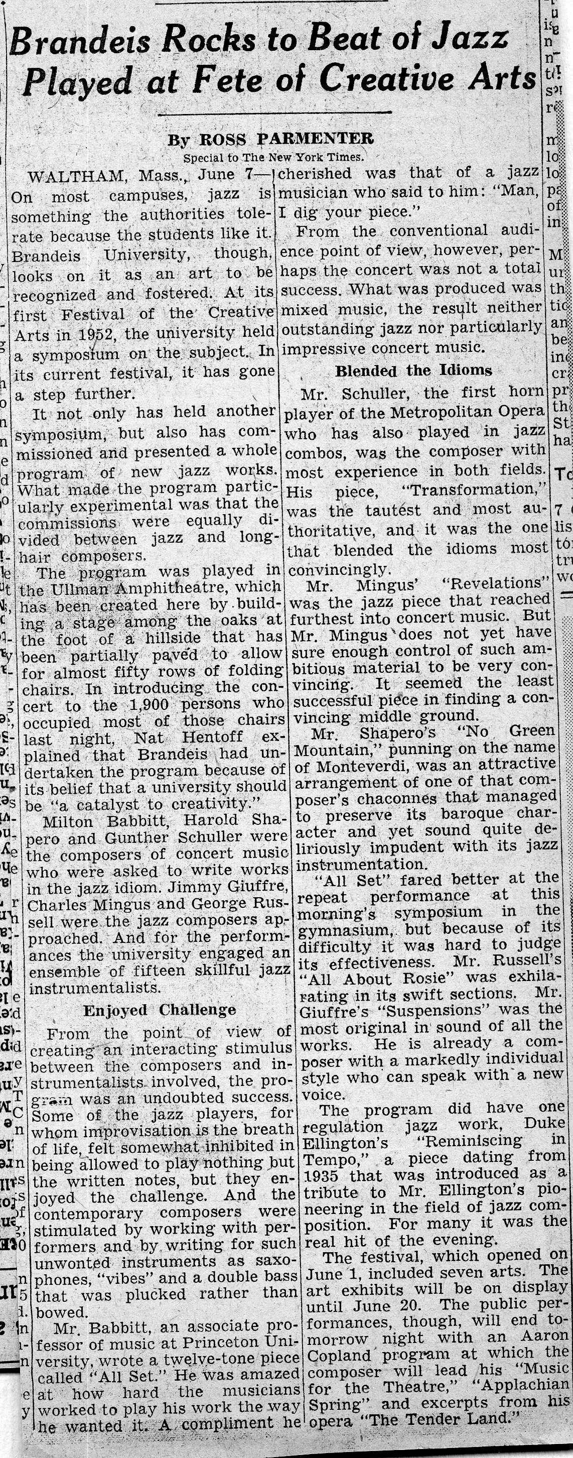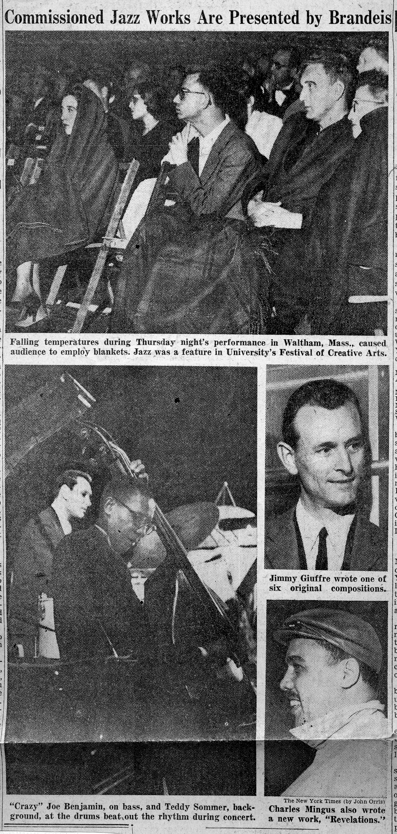 Regarding the Brandeis Festival recording, it wasn’t mentioned (although it may have been inferred) that not only did they rehearse those pieces over a couple of weeks, but they performed them live at the actual Festival of the Arts (campus of Brandeis University) on June 6 & 7, 1957, a few days before going into the studio (June 10,18 & 20) back in NYC. Most of the same musicians that ended up on the recording performed those concerts. However, I’m not sure if Mingus participated as a player on his own composition. He was certainly present at the Brandeis concerts. Fred Zimmerman, Mingus’ teacher, was perhaps only asked to help out on the recording and therefore, leaving Mingus to tackle his own arco parts for the concert performances.