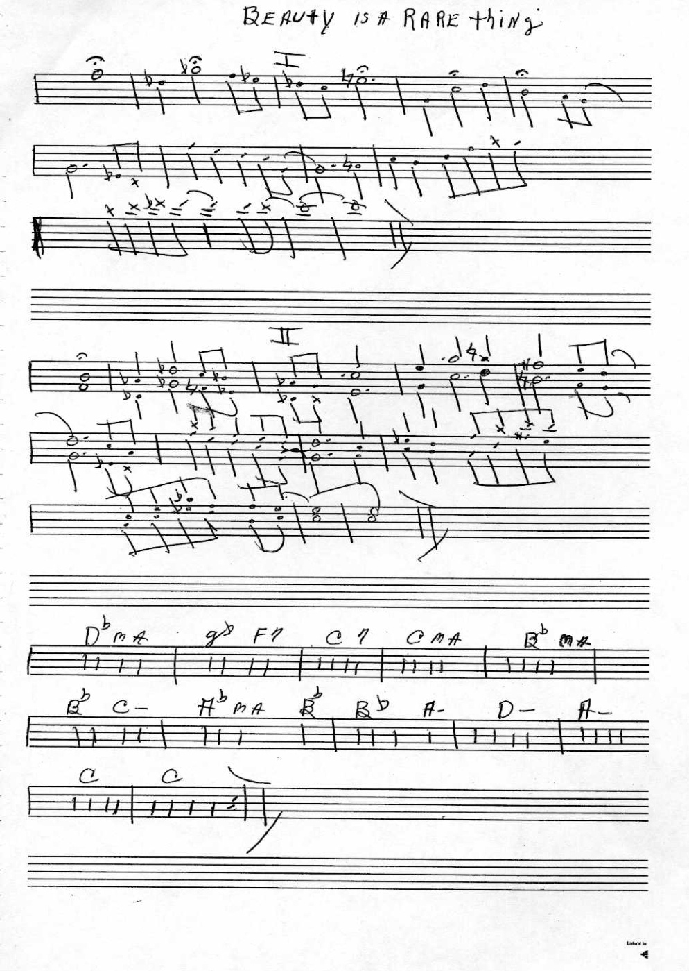 “Beauty is a Rare Thing” shows the melody (or head in) as a single line and then with Harmony added on the head out (part 2)…the way they played it on the original recording from This Is Our Music. Don may have added changes to accompany the melody at the bottom as a suggestion, although it’s difficult to say whether they had any specific purpose. Charlie Haden certainly had another idea of what roots to play on the actual recording. Note that Ornette plays the harmony part on the head out leaving Don to play the melody.