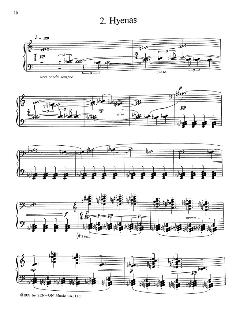 “Hyenas.” Obviously, something of Béla Bartók, but — crucially — also something of Duke Ellington. The dominant seventh chords that show up in the right hand are Ellington chords, especially when used as parallel percussive chimes. The first climax is noted in 3/4 swing rhythm, it really sounds like “jazz.” Eventually the performer is directed to improvised in the style of the piece. Yeah!