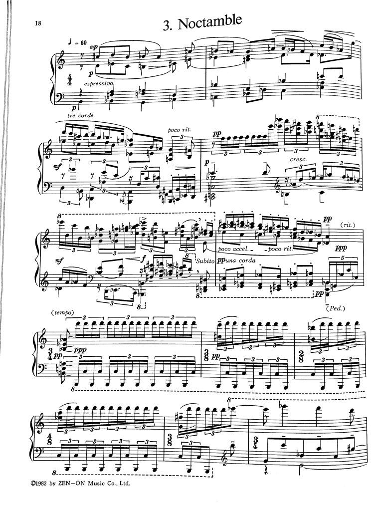 “Noctamble.” Starts as a jazz ballad: Thelonious Monk gone further left. Bartók’s “night music” effects are another reference. Those two antipodes, bluesy melodies and chattering insects, fight each other across six virtuosic pages. Periodic thumps (including the last gesture) are written in 12/8 and suggest a classic jazz ride cymbal beat.