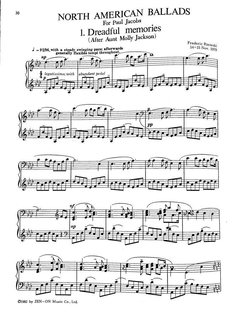 “Dreadful Memories.” The best-known Rzewski works after The People United are the North American Ballads. Paul Jacobs commissioned the set for an important LP, Blues, Ballads & Rags, which also included music by Aaron Copland and William Bolcom. Jacobs was a great artist, but his performance sounds like a classical pianist. When I listen to Rzewski play crunchy eighth notes during the opening paragraph of “Dreadful Memories,” names like Ray Charles or Richard Tee come to mind. (He recorded it twice; the later one on Nonesuch is good too, but the pianism on the Hat Art is perhaps more fearless overall; certainly the reproduction is more direct.)