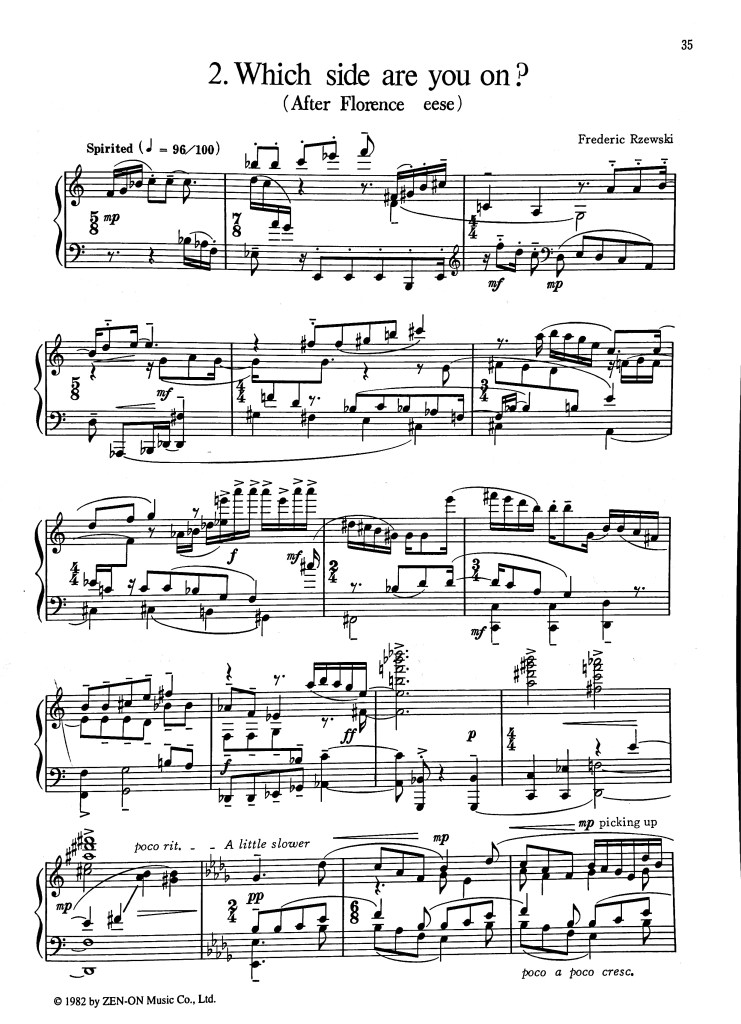 “Which Side Are You On?” The old tune concerns organized labor and crossing the picket line. When Rzewski wrote these pieces, a battle was raging in so-called “new music” between the old avant-garde (Stockhausen, Boulez, Carter, Babbitt) and the incoming minimalists (Glass, Reich, Riley). Along with Ligeti, Rzewski was a serious diplomat, at least in the sense that he saw value in drawing from both sides. During “Which Side Are You On,” the debate plays out in a laughably literal way: All these years later, the moment when the opening discordant texture is replaced by a pure C minor vamp remains shocking. How dare he?