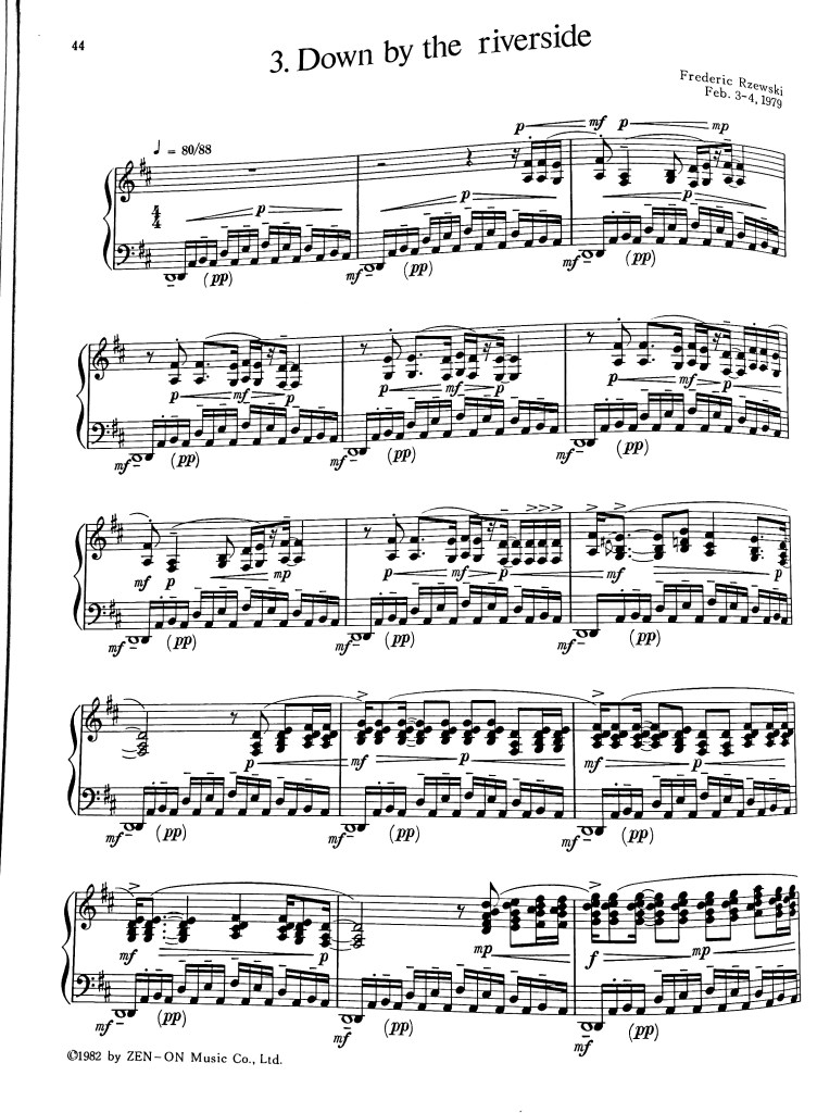 “Down by the Riverside.” All the elements come together for the ultimate expression of Rzewski’s pianistic art. The stroll through the opening statement swings hard, the deconstruction is pure madness, and the apotheosis is incandescent.