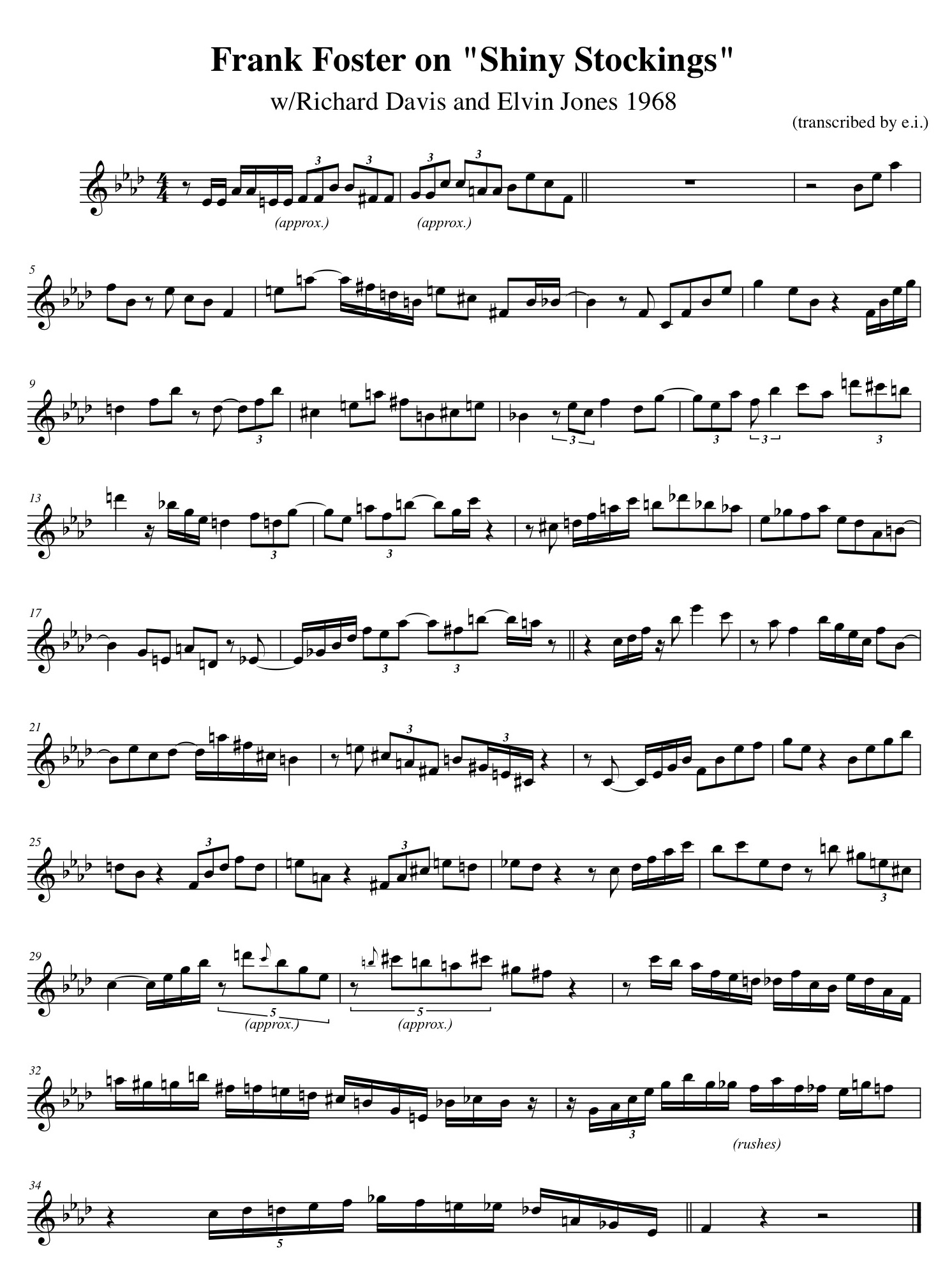 When I transcribed Foster’s solo “Shiny Stockings” with Elvin Jones and Richard Davis, I was flummoxed trying to notate the opening two-bar break. What follows is only approximately correct. But Foster and Jones know something I don’t, for they land it right together before going into the chorus. Boom.