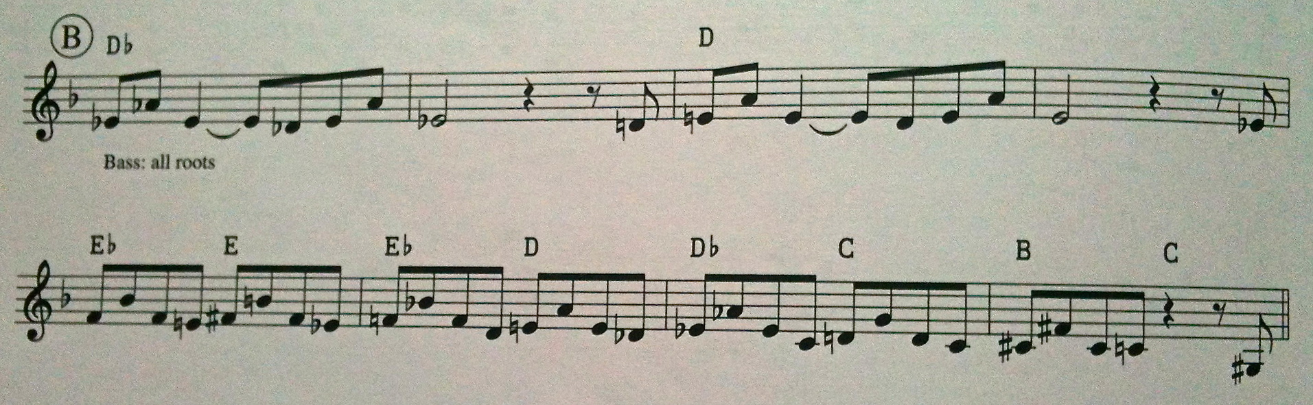 Monk’s mischief may be teaching a greater truth. I’d argue that his lesson is that Terry’s tune doesn’t need any waltzing “B” section whatsoever. The nice melody of “A” could just be 16 bars, two 8s with different closures, something like Horace Silver’s “The Preacher.” This folkloric solution would be more groovy than going to further progressions for a bridge.