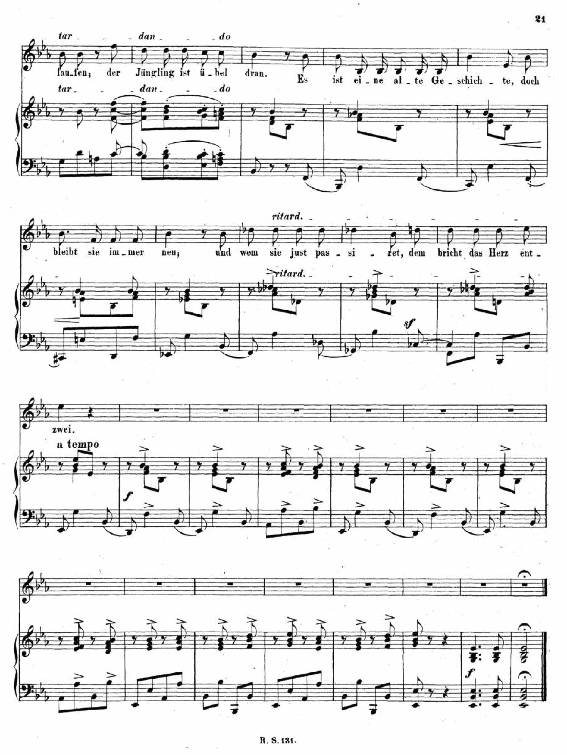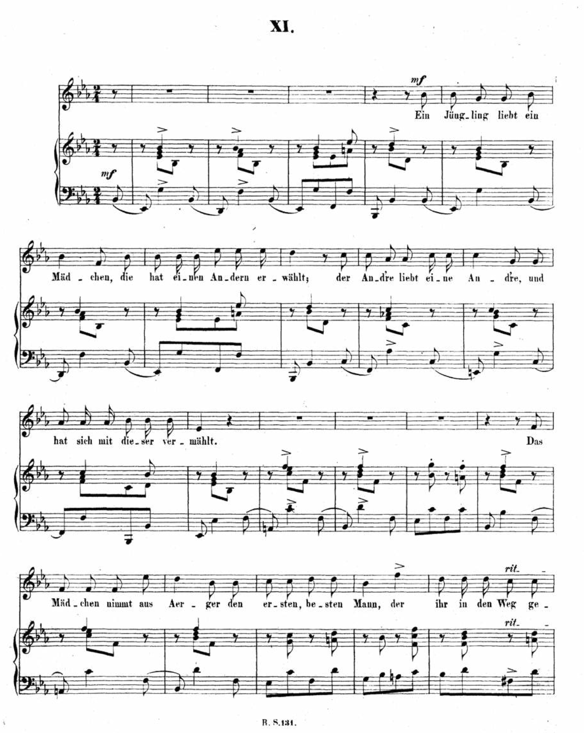 Taken by itself, this opens with a jolly swing to it, but only the first two bars have the character of a folk song, while the rest has a coarse air which is, like the poem, at once infectious and repellent. The tune is not only undistinguished, it is ostentatiously commonplace, with several deliberately awkward moments, like the end of the first stanza (bars 11 and 12); in the last stanza the repeated notes of the final bars of the vocal part (bars 29-31) are, moreover, positively ugly. Even if one puts a higher value on this song than I think is justified, it is clear that for Schumann it could not exist outside the cycle. It is, in its angular and banal insistence, a deliberately bad song, but magnificent in its place. Its coarseness makes Heine’s facetiousness more profound as well as more dramatic. Taken by itself it might be a comic parody: in the cycle, its comedy is not humorous but deeply moving, above all because it makes no concessions to grace or charm.